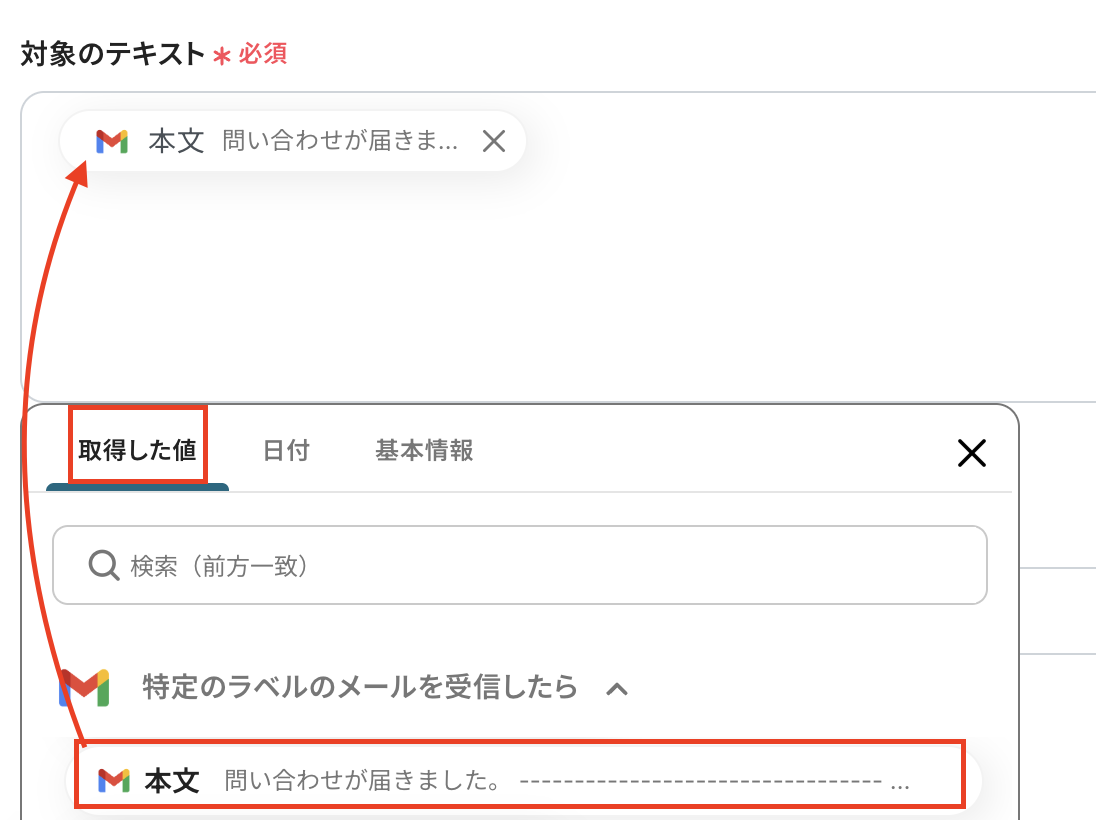 詳細を設定を行います。 このアクションでは、Gmailで受信した内容からAirtableに登録したい項目を抽出するために行います。 対象のテキストはGmailの取得した値から「本文」を選択してください。 取得した値を活用することで、固定値ではなく、トリガーが実行されるたびに最新の情報が反映できます。 メール内容を手入力してしまうと、同じ内容から繰り返し抽出することになりますので、取得した値を活用しましょう。 詳細はこちら を確認してください。