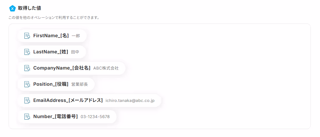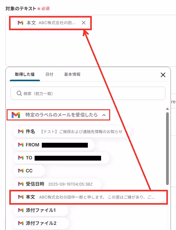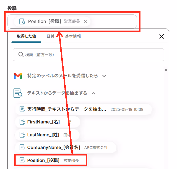 API接続設定画面では、以下のように抽出したテキストから値を選択できます。必須項目以外は空欄でも問題ありません。