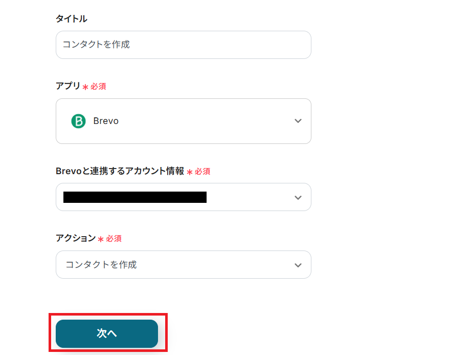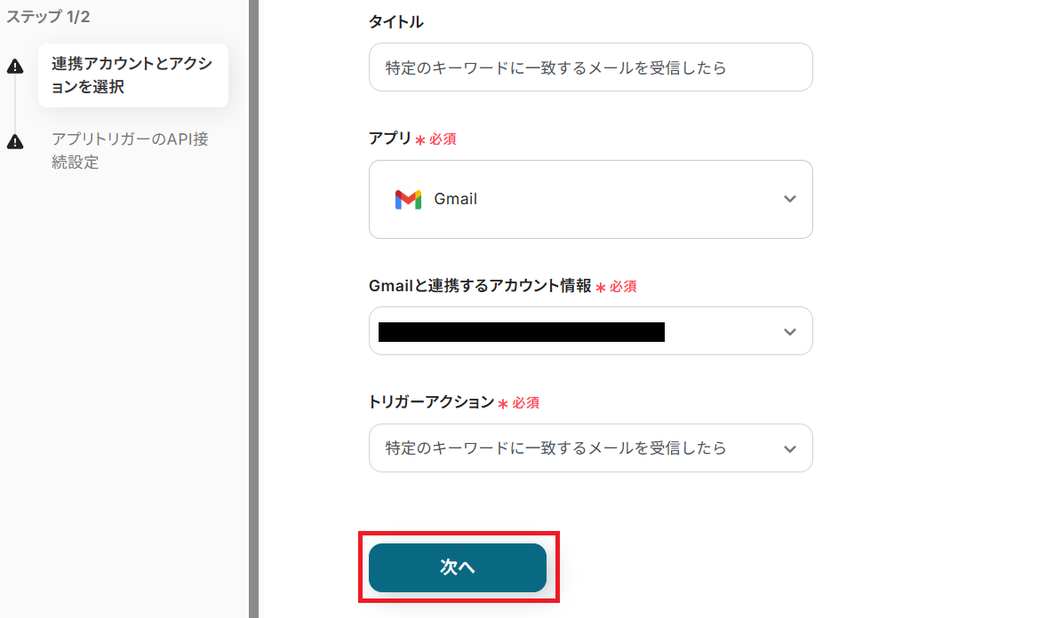 タイトルを任意で設定したら、連携アカウントとトリガーアクションの内容を確認して「次へ」をクリックしてください。