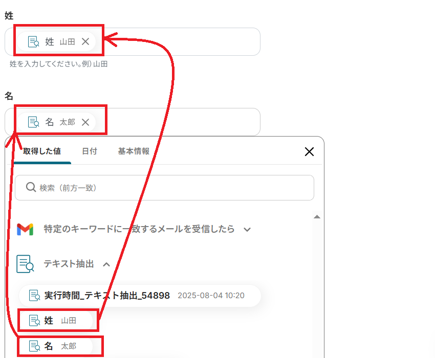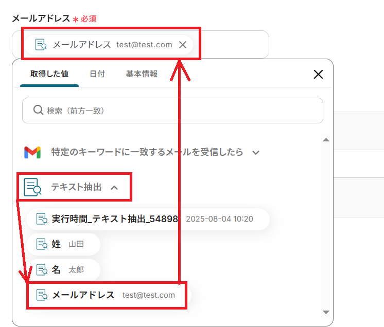 前ステップで送ったメールから顧客名とメールアドレスを抽出するために、今回は以下のように入力してみました。