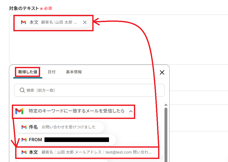 テキストを抽出する対象となるデータを選択します。ここでは、先ほど取得した値の中からメールの本文を選んでください。