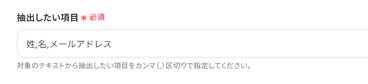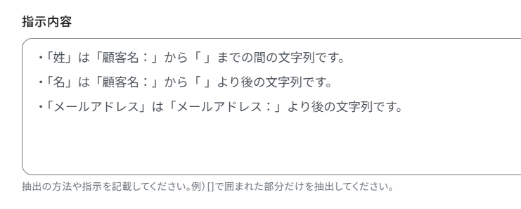 受け取るメールの内容に合わせて「〜の範囲が〇〇です」と明確に指示したり、抽出項目を具体的に設定してください。また、お問い合わせメールの文面に定型項目を設けておくのもおすすめです。