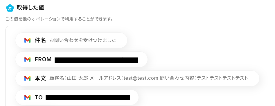 「テスト」ボタンを押してみましょう。取得した値として、抽出したい項目が以下のようにメール本文から反映されていれば成功です!