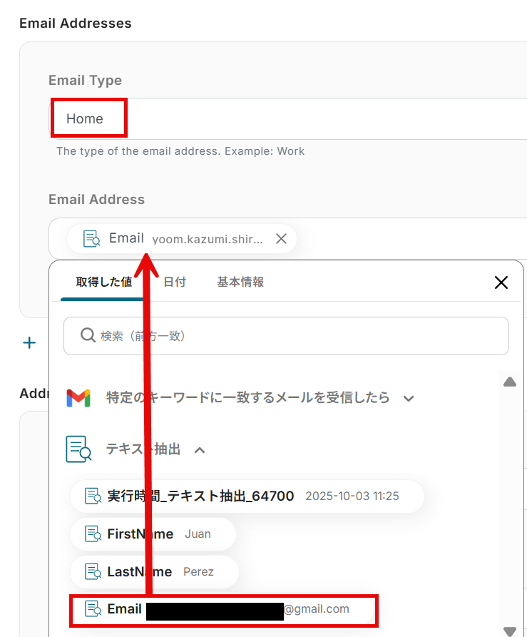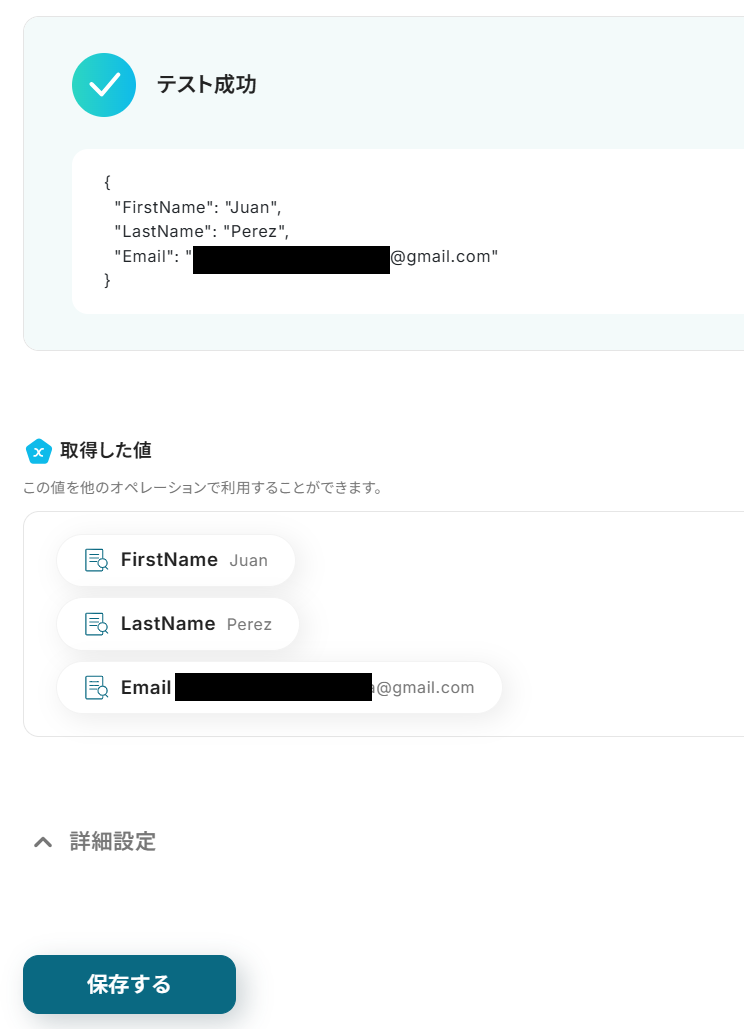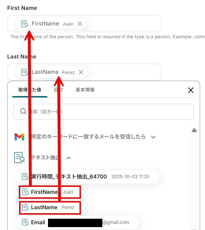 「First Name」と「Last Name」は前項で取得した値から選択します。