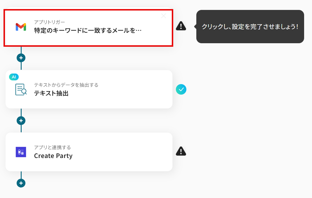 - トリガーアクション:Gmailで特定のキーワードに一致するメールを受信したら起動します。