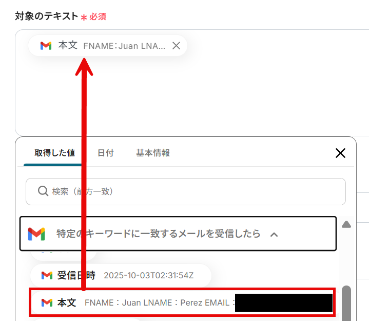 対象のテキストを前項で取得した値から「本文」を選択します。