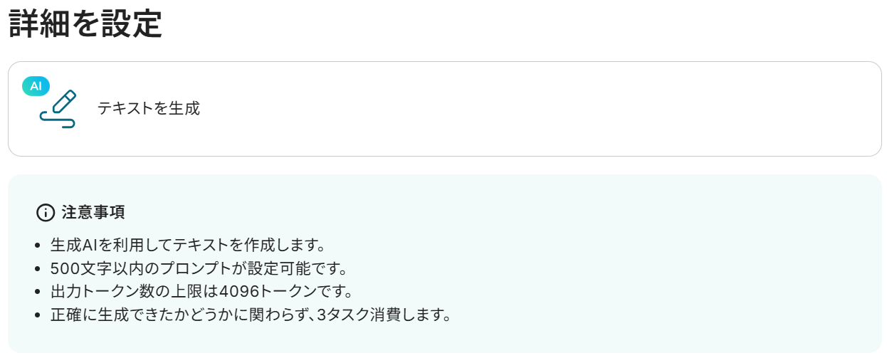 ステップ3と同様、アクションは「テキストを生成|500文字以内(3タスク)」のまま「次へ」をクリック。