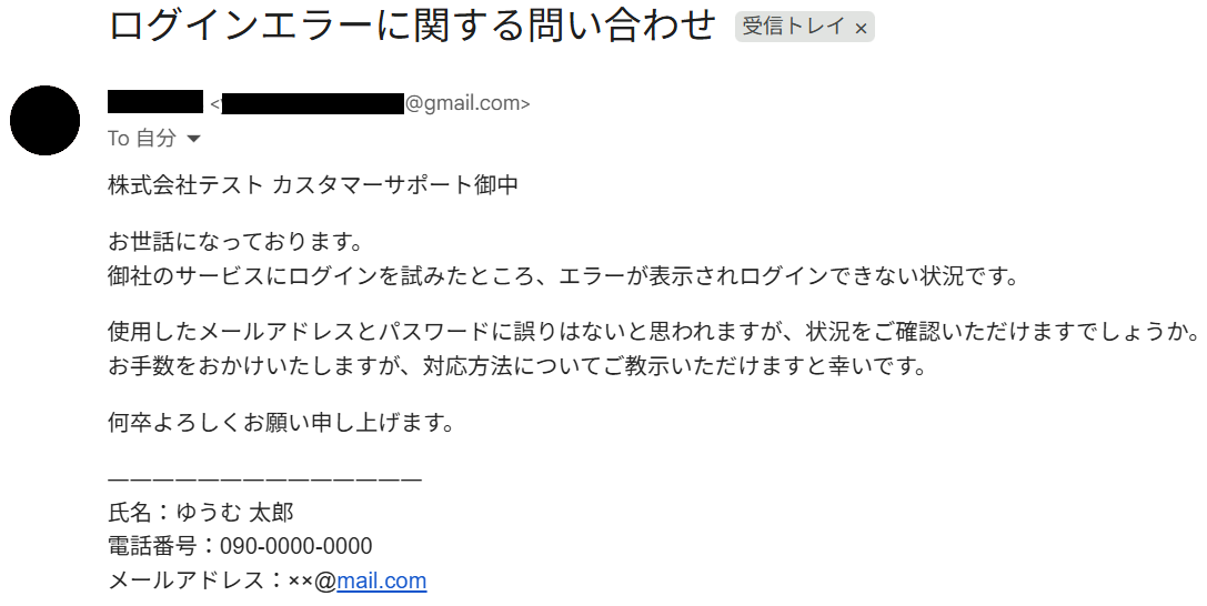 今回は以下のように、件名に「問い合わせ」というワードが入ったメールを送信しました。