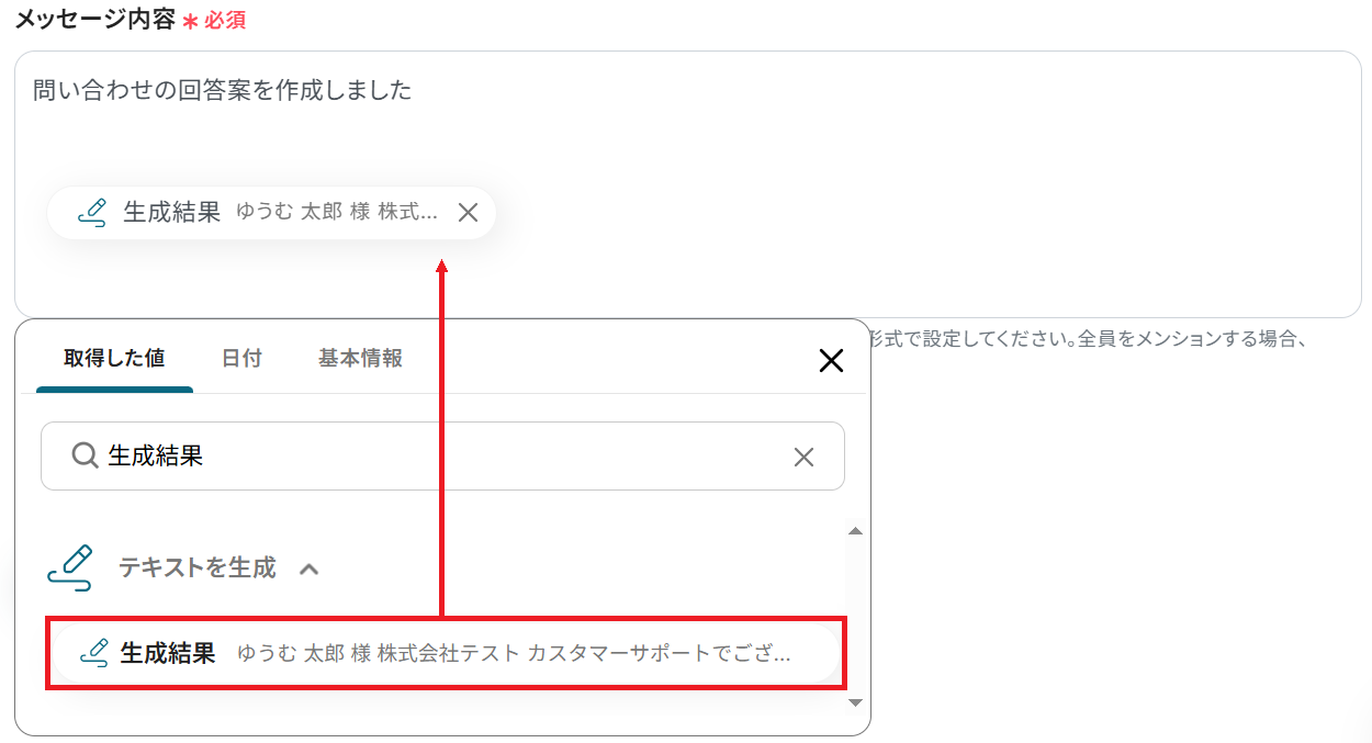 固定の文章や、ステップ4で取得したアウトプットなどの変数を組み合わせて自由にカスタマイズできます。