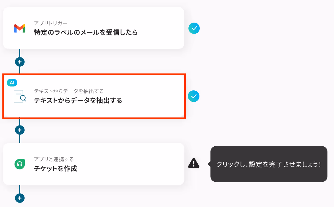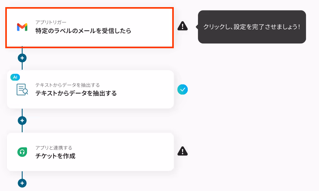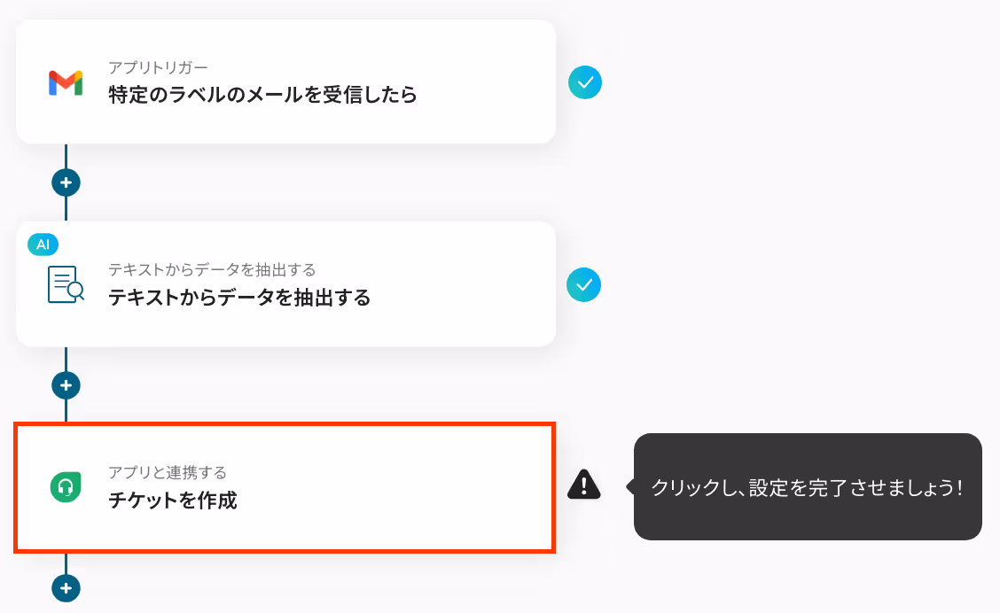 今回のフローを修正したい場合は、「チケットを作成」直下にある+ボタンをクリックし、Slackなど連携したいツールを追加することで設定できます。
