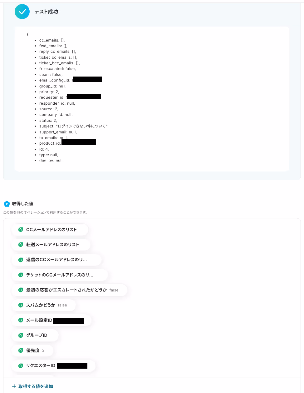 テストが成功すると、以下の画像のような取得した値が表示されます。
