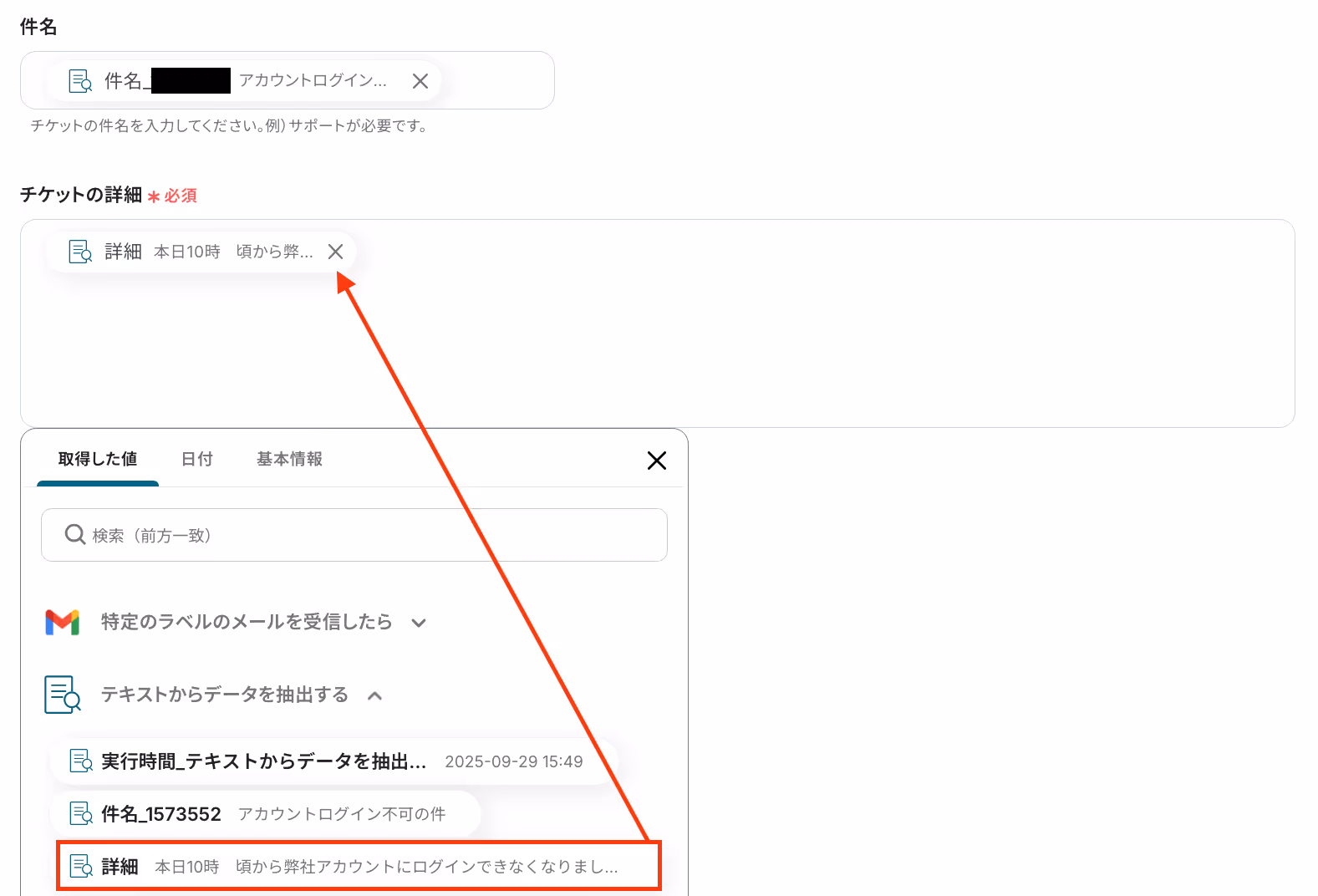 「メール」は、Gmailのトリガー設定で取得した値から選択してください。