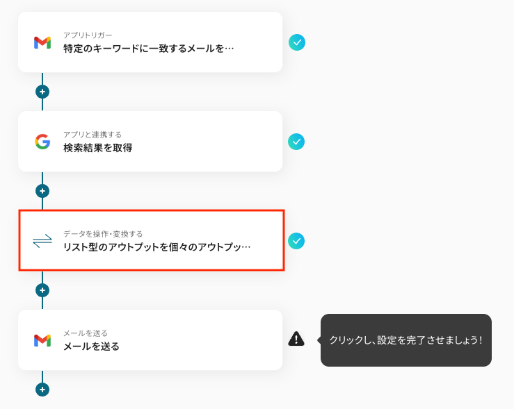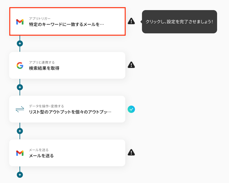 Gmailで特定のキーワードに一致するメールを受信後、Google 検索で検索結果を取得するための設定をします。