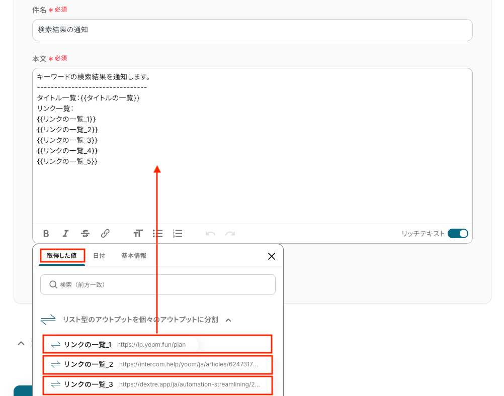 同様に、「件名」「本文」も取得した値から選択し、必要に応じて任意のテキストを手動で入力してください。