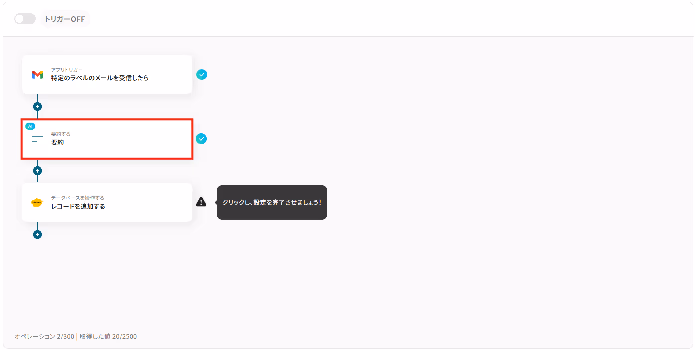このフローでは、Gmailで受信したメール本文をAIが自動で要約し、その結果をkintoneのレコードとして追加します。