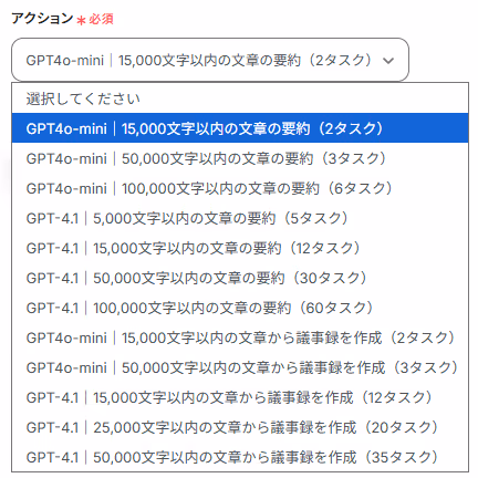 「アクションを選択」画面で以下を設定していきます。