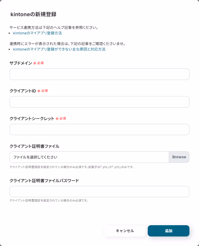 「kintoneの新規登録」の画面では、kintoneのマイアプリ登録方法やkintoneのマイアプリ登録ができない主な原因と対応方法のヘルプページを参考に入力を進めてください。