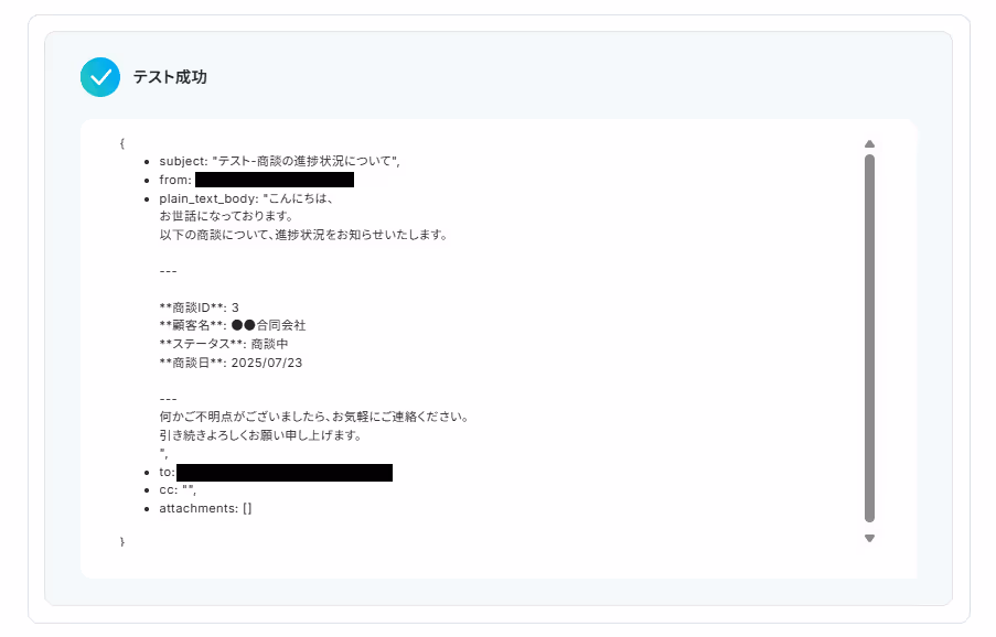 テスト成功の文字が表示され、指定したラベルに保存されている最新のメールが取得できていることが確認出来たら設定完了となります。