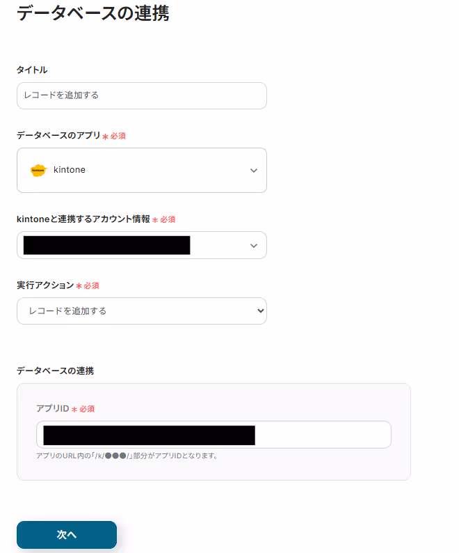 「データベース操作の詳細設定」画面には、紐づけを行ったkintoneのアプリのレコード名が表示されています。