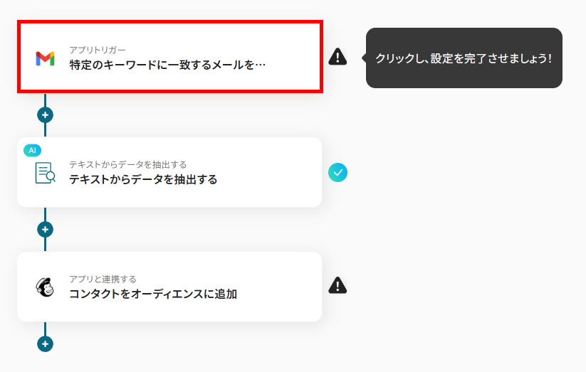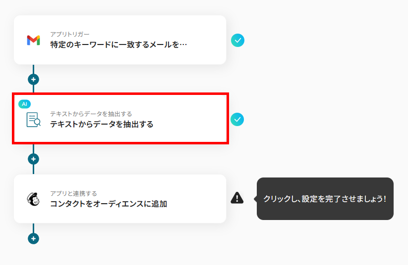 - Gmailのトリガー設定、テキストの抽出設定およびMailchimpのアクション設定