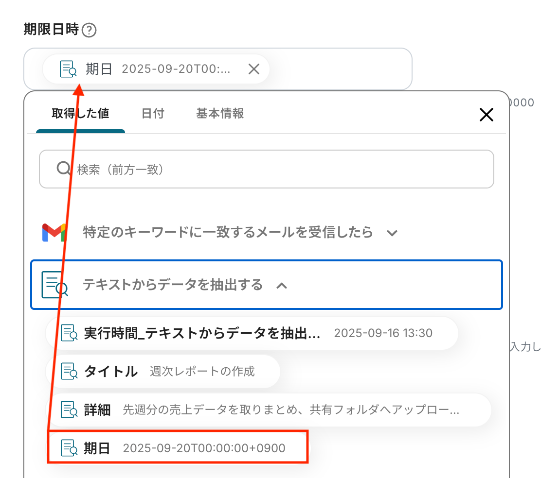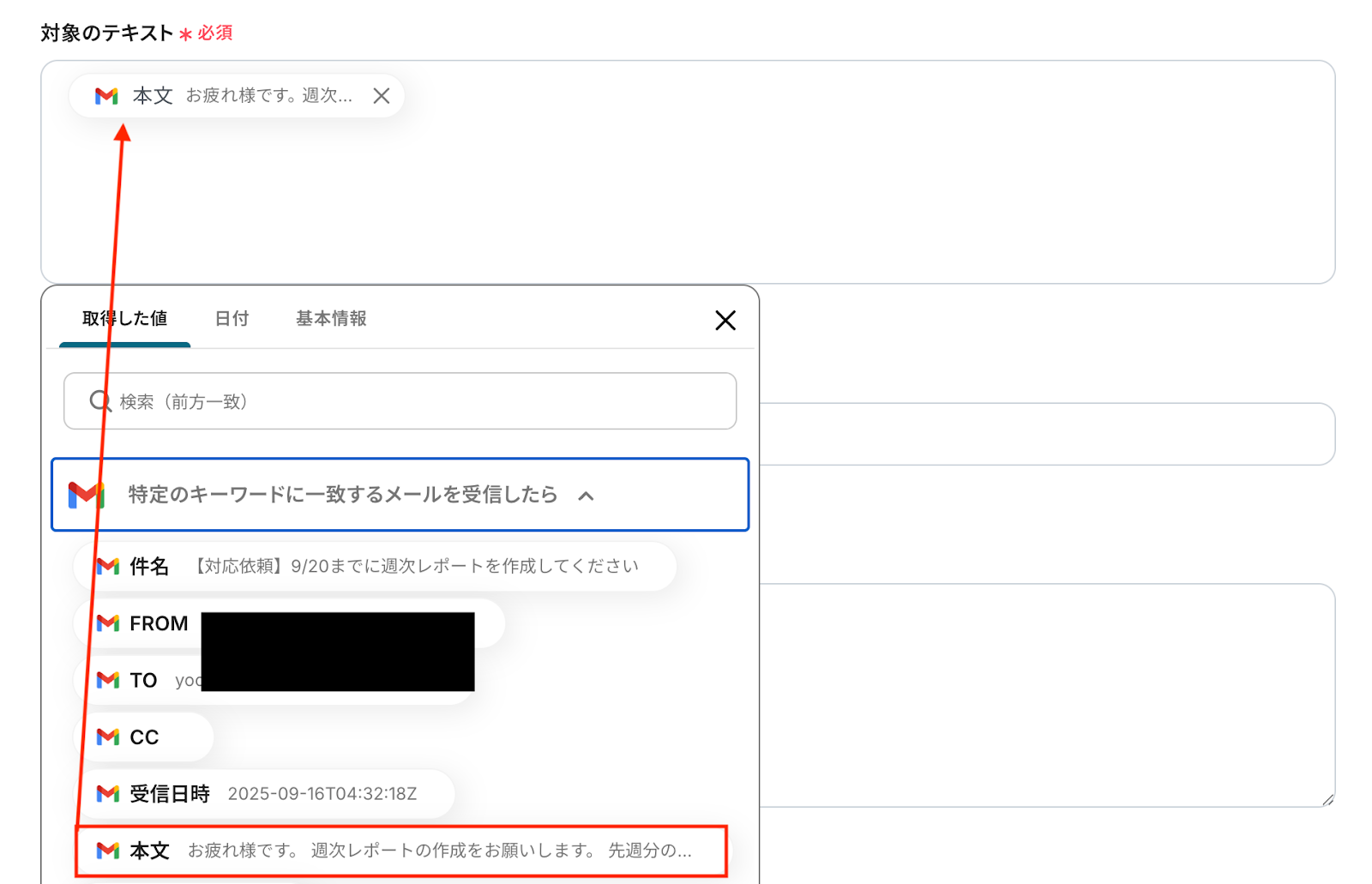 入力欄をクリックすると、前のステップでGmailから取得済みの値が表示されるので選択しましょう。