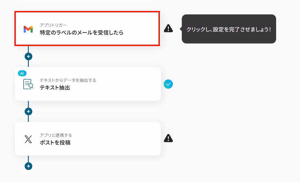 Gmailで特定のラベルが付与されたメール(例えば、プレスリリースや重要なお知らせなど)を受信したことをトリガーに、メールの件名や本文から必要な情報を抽出してX(Twitter)に自動でポストを投稿します。