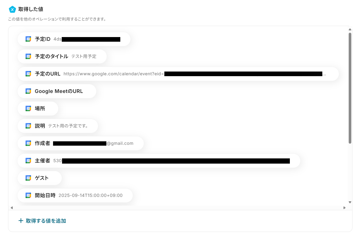 - テストに成功すると、「取得した値」に各ID情報が追加されます。