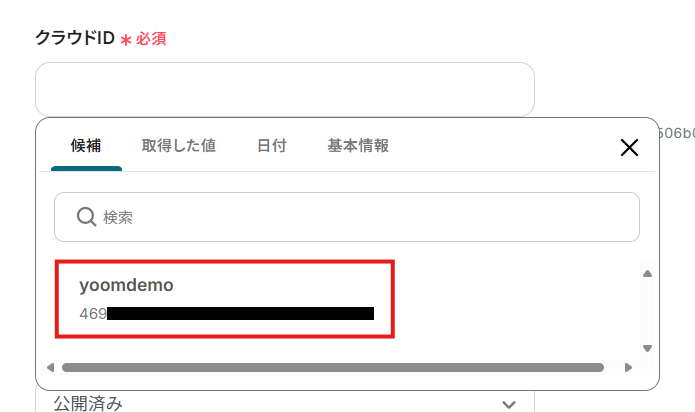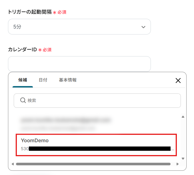 入力欄をクリックすると、連携しているアカウントから候補が表示されますので、対象となるカレンダーを選択してください。