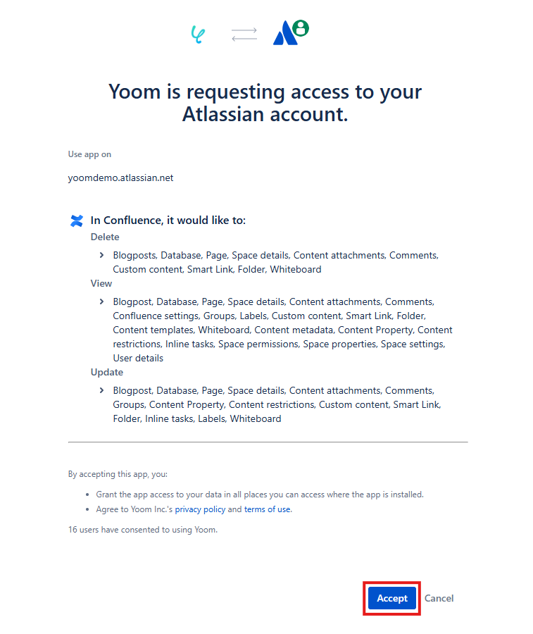 - YoomからAtlassianへのアクセス権限を確認し、「Accept」をクリック。