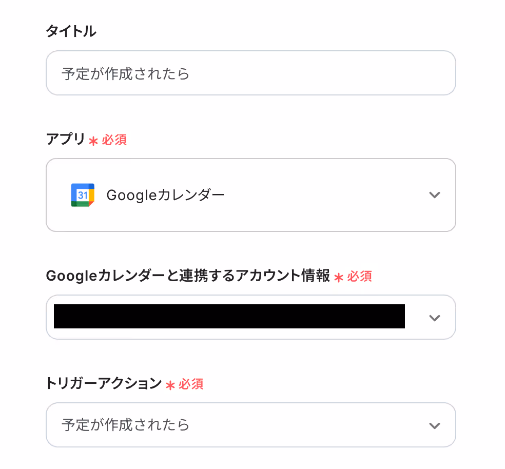 「トリガーアクション」:デフォルトで「予定が作成されたら」が選択されているので、そのままでOKです!
