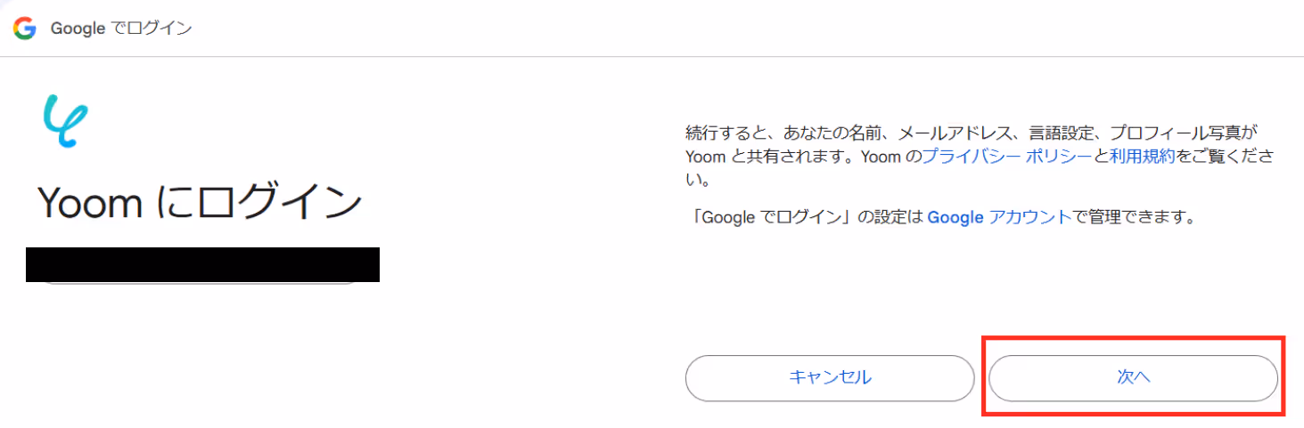 Yoomとの共有に関する画面が表示されるので「次へ」を押します。