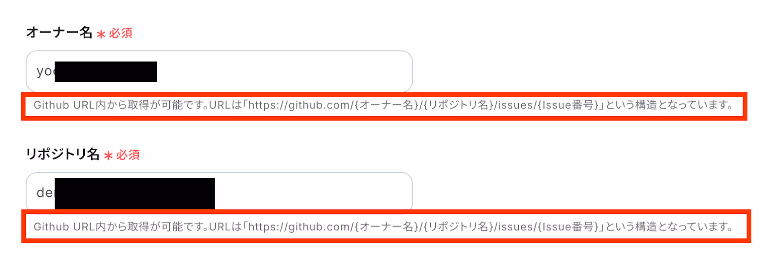 作成したい場所の「オーナー名」と「リポジトリ名」について、赤枠部分の文言を確認しながら入力してください。