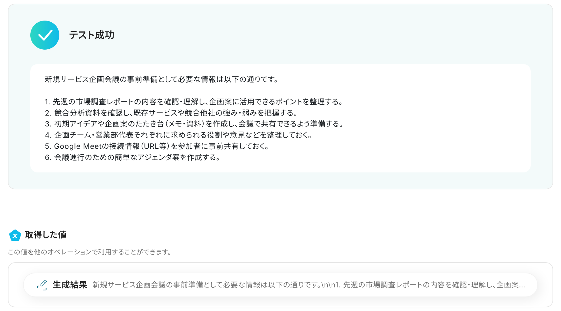 この自動化は、AIによる情報生成の処理を含むパターンであり、毎回手入力していた定型文の作成時間を削減し、予定情報の質と一貫性を高めることで、よりスムーズな会議運営を支援します。