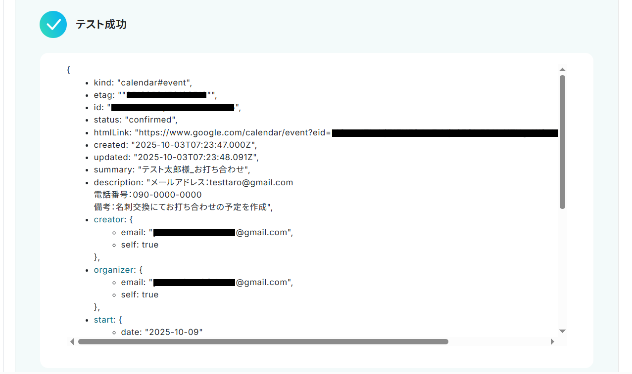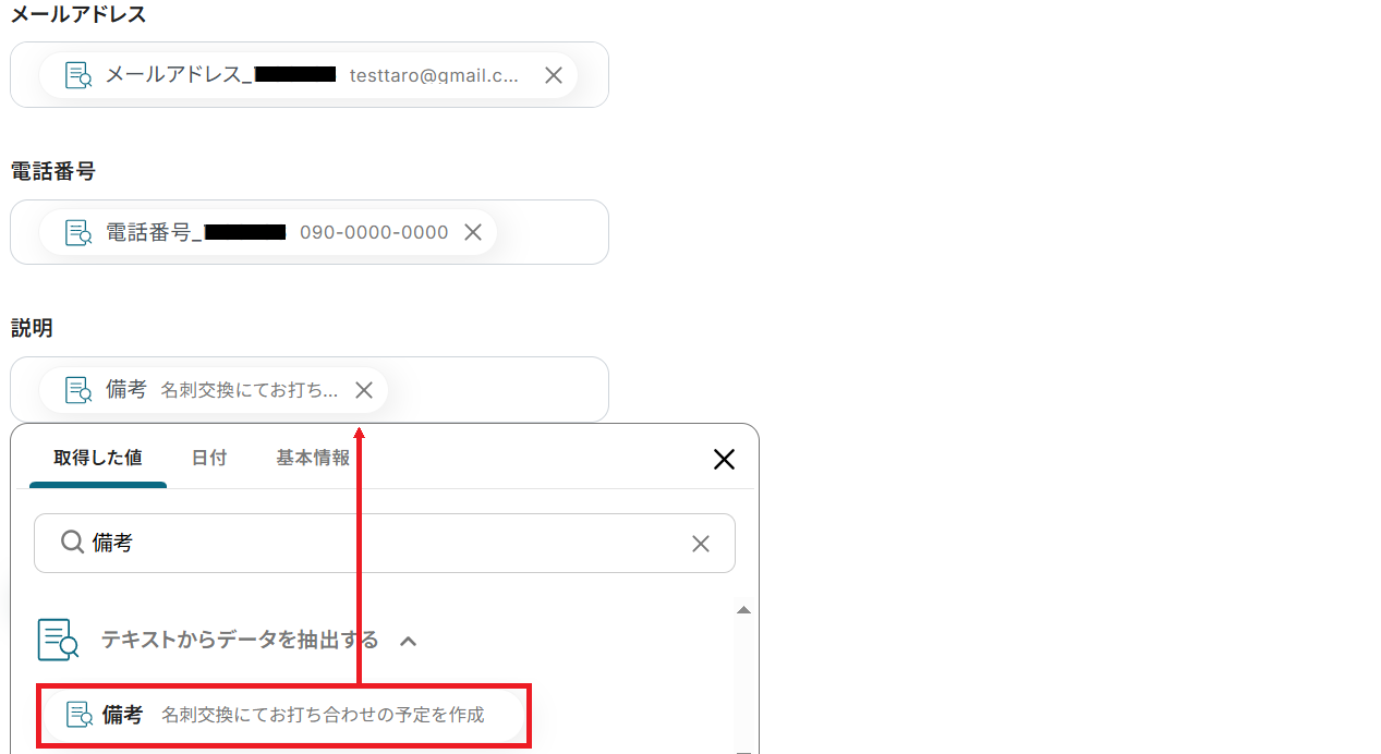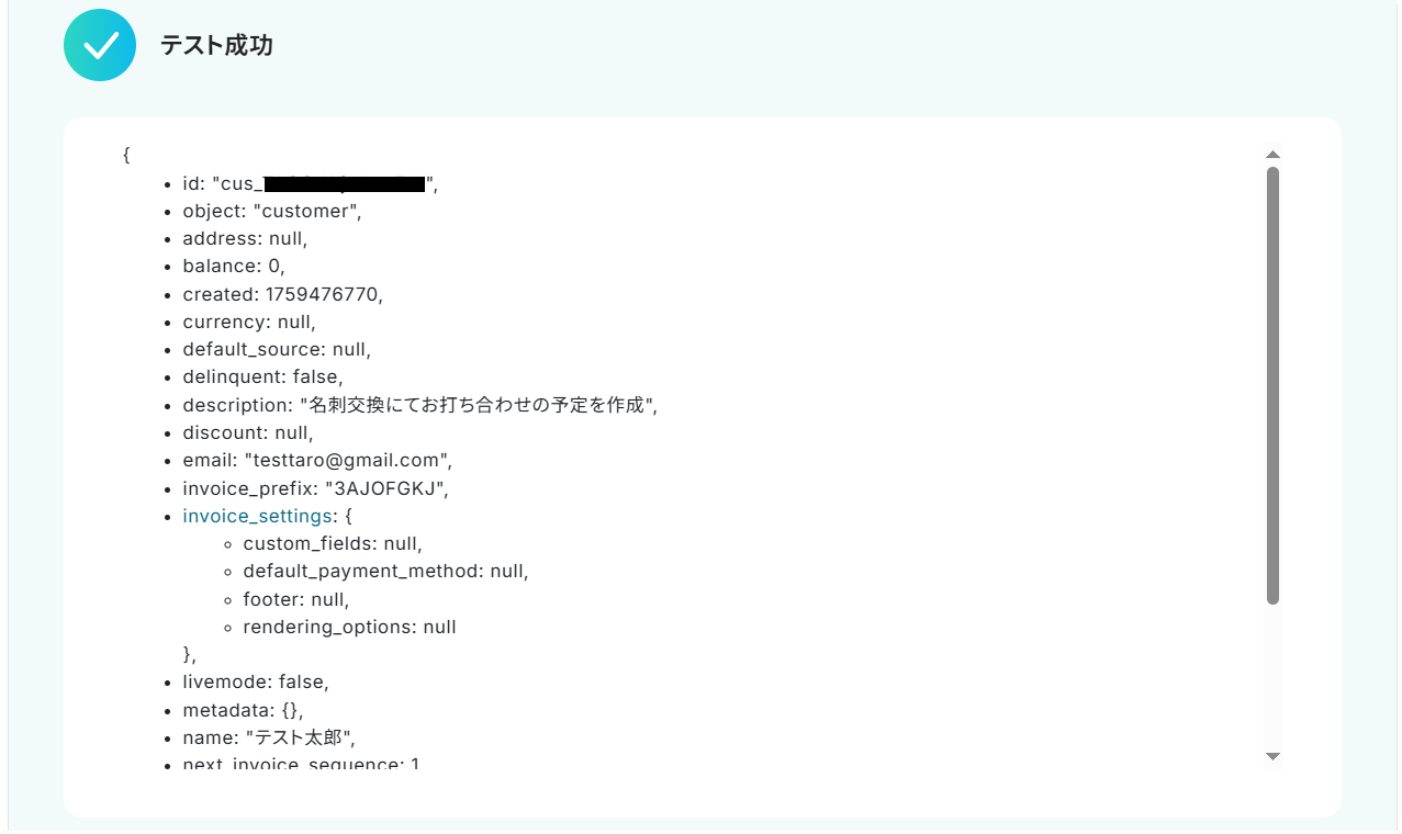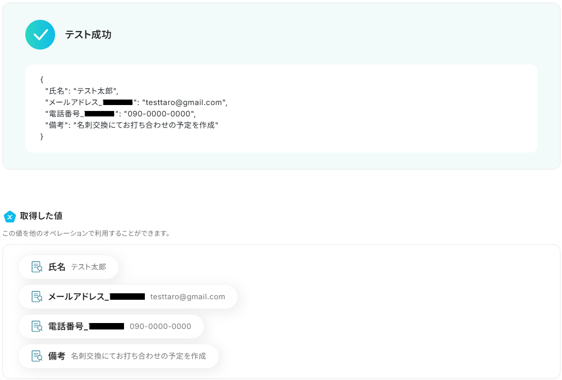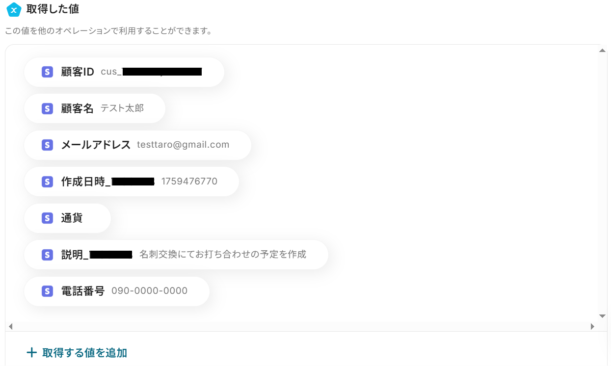 ステップ4と同様に、顧客名・メールアドレス・電話番号・説明にそれぞれ取得した値があらかじめ設定されているのでそのままテストしてください。
