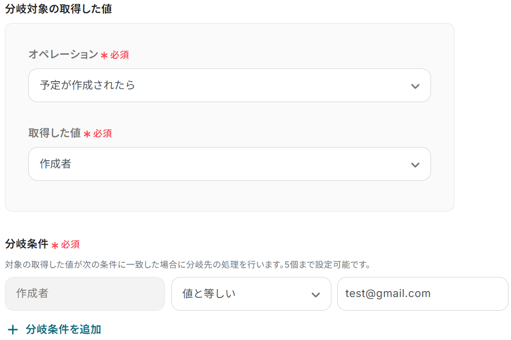 A:分岐設定を追加することで可能です。例えば分岐条件を「作成者が特定のメールアドレスと等しい場合」などと設定することで、特定の作成者の予定のみ連携するフローを作成することができます。