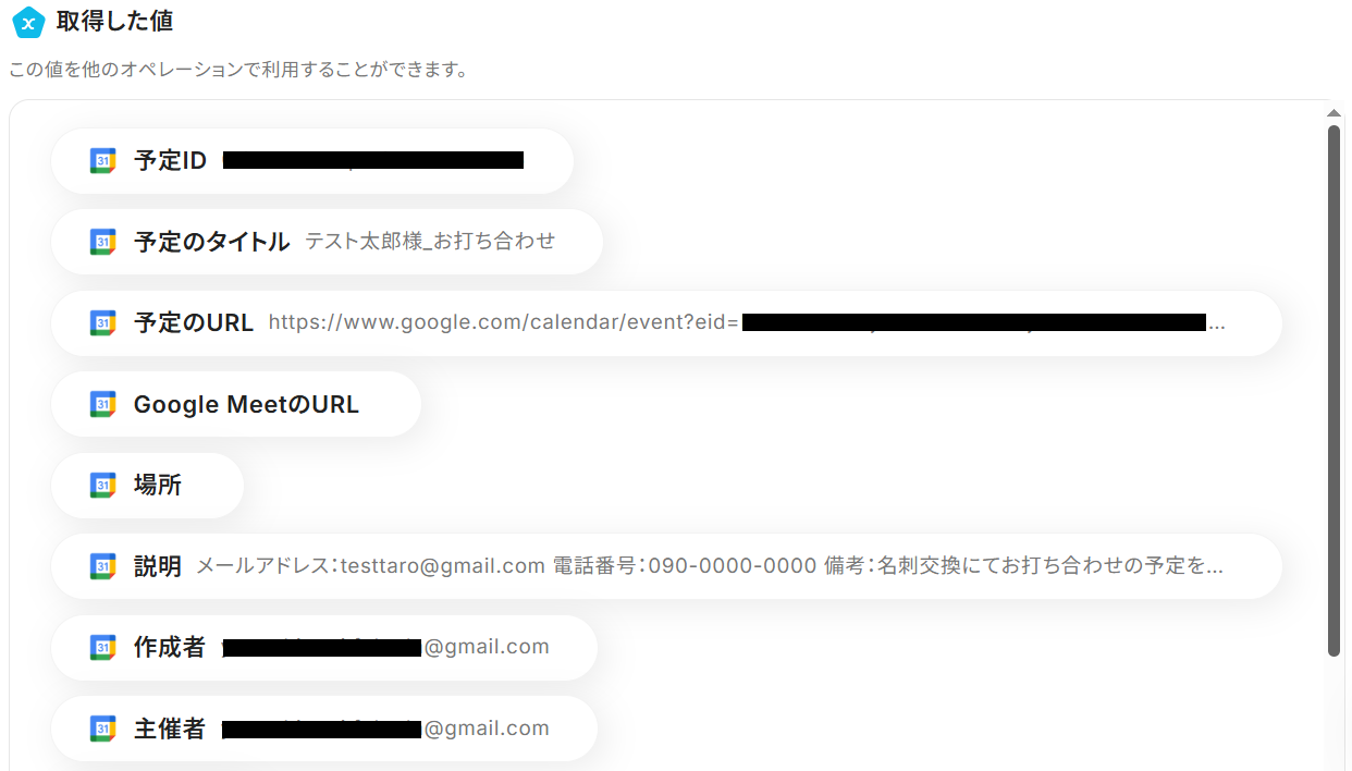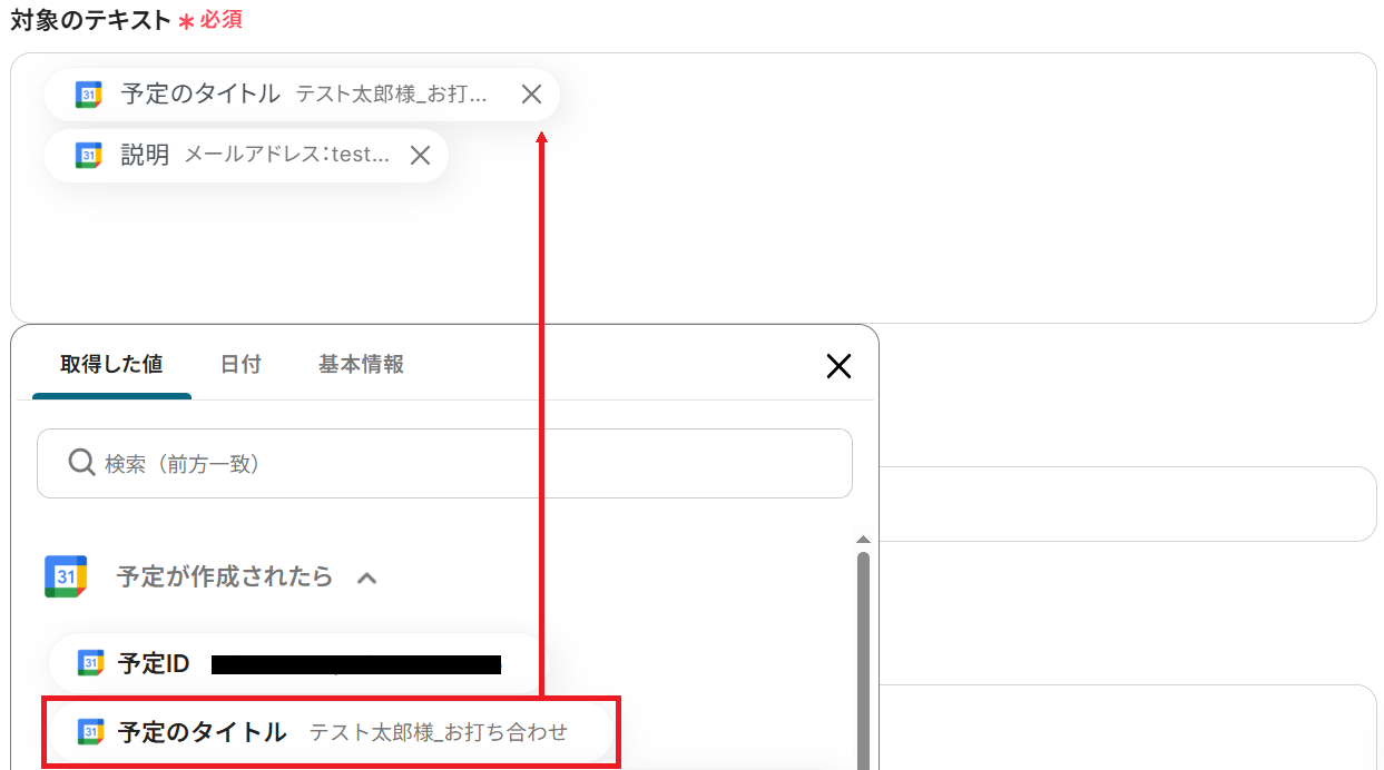 ※以下のようにGoogleカレンダーから取得した値を設定することで、トリガーが実行されるたびに最新の情報を反映できます。