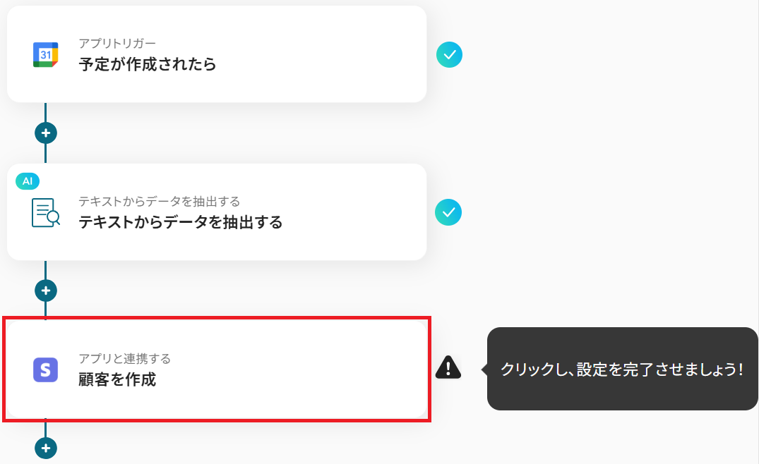 この連携は予定情報から特定のテキストを抽出する処理を含むため、手作業による顧客情報の登録漏れや入力ミスをなくし、請求書発行などの後続業務をスムーズに開始できます。