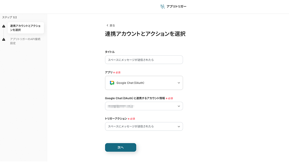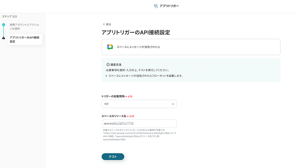 ステップ3:アプリトリガー「スペースにメッセージが送信されたら」