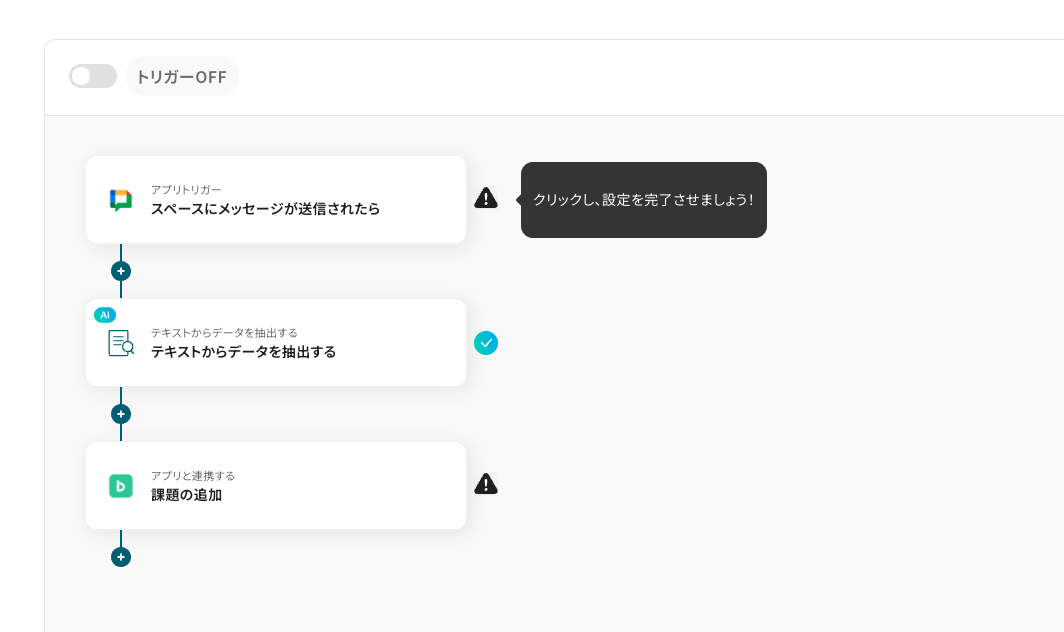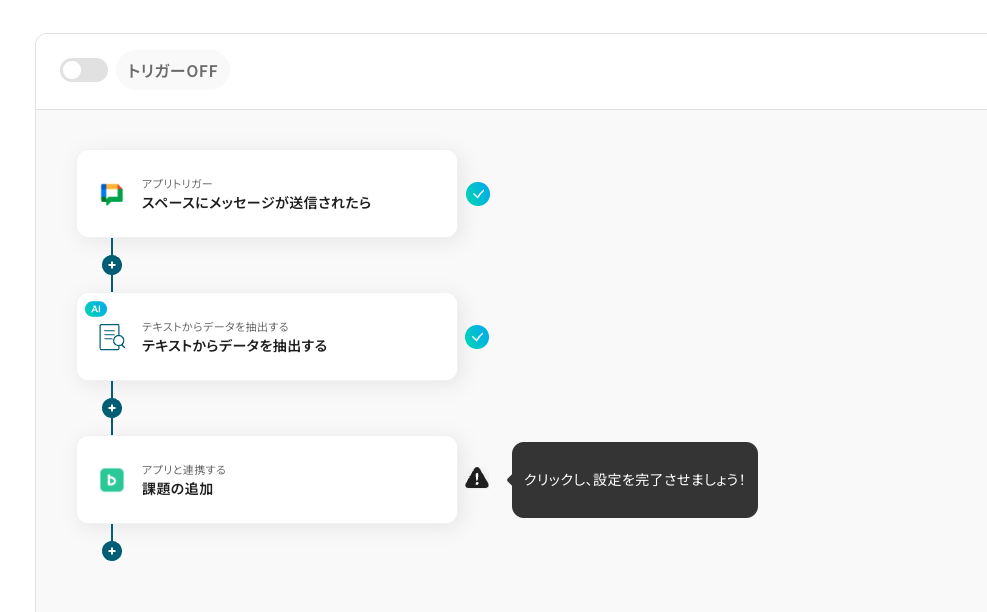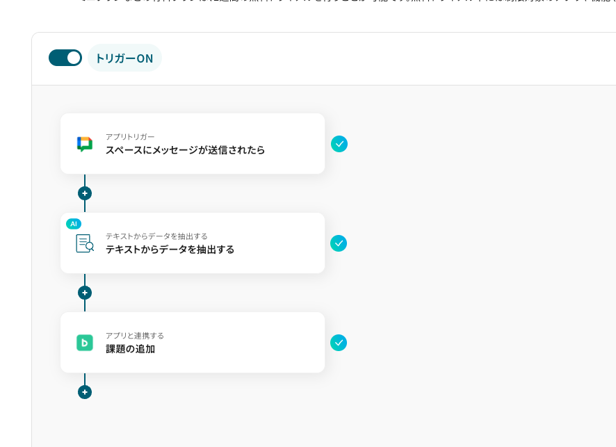 ■概要 「Google Chatで投稿されたメッセージ内容から、課題の詳細を要約しBacklogで課題を作成する」業務ワークフローは、チャットに寄せられる要望や報告を自動で抽出し、Backlogへタスク化。 BacklogとGoogle Chatの連携を活かし、手軽に情報共有から課題管理まで一気通貫で進められます。 ■このテンプレートをおすすめする方 ・Google Chatでの会話をBacklogへスムーズに課題として登録したい方 ・チャットの要望や指示を見落とさず、手動入力作業を軽減したいチームリーダーの方 ・BacklogとGoogle Chatの連携で共有からタスク化までワークフローを一元化したいプロジェクトマネージャーの方 ■注意事項 ・Google Chat、BacklogのそれぞれとYoomを連携してください。 ・トリガーは5分、10分、15分、30分、60分の間隔で起動間隔を選択できます。 ・プランによって最短の起動間隔が異なりますので、ご注意ください。 ・Google Chatとの連携はGoogle Workspaceの場合のみ可能です。詳細は下記を参照ください。 https://intercom.help/yoom/ja/articles/6647336