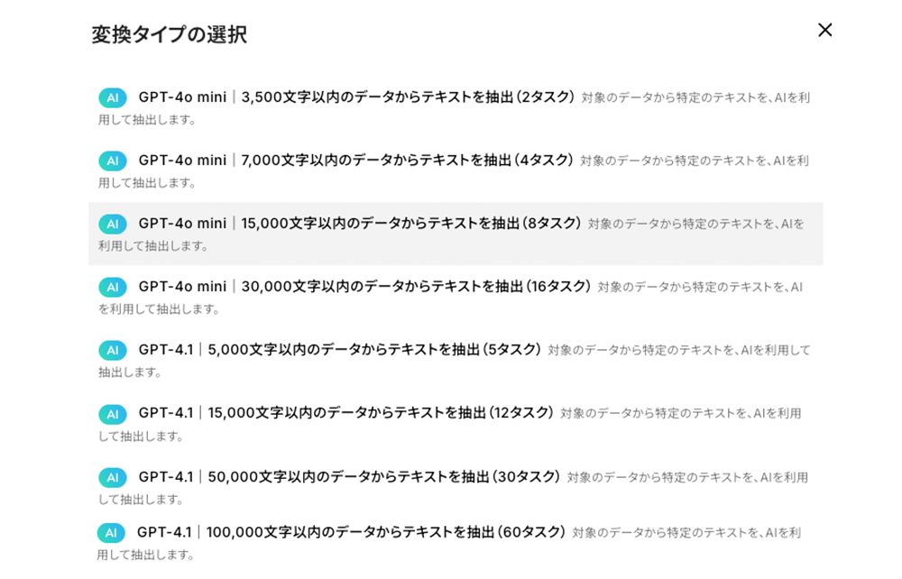 AIのタイプと、テキストの内容で消費タスクが異なります。フローボットを起動させてみて、運用にあったタイプに変更することもできますので、一旦事前設定のまま進めます。