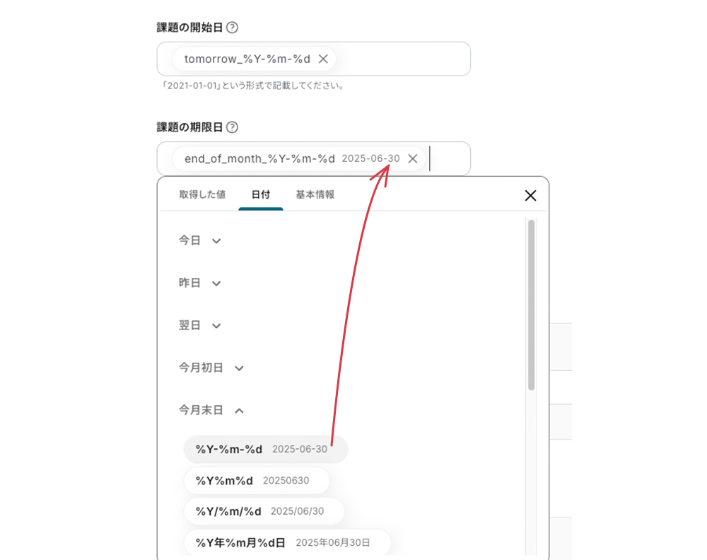 課題の期限日 デフォルトの値を設定します。編集欄をクリック<プルダウンメニュー<日付タブ 様々なタイプの日付の動的コードが引用できます。形式はBacklogの形式(2025-00-00)を選んでください。