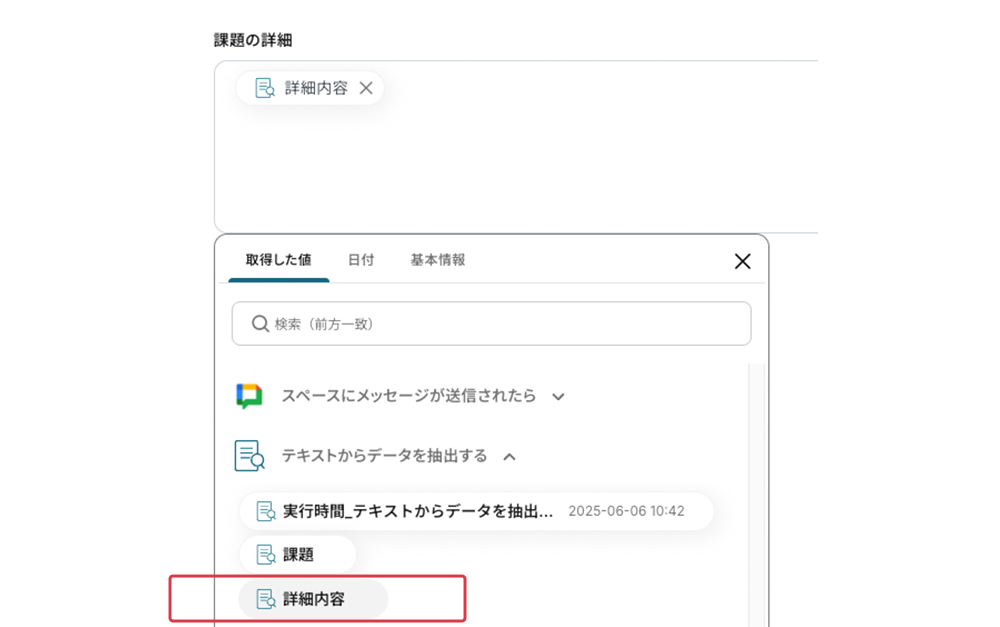 事前設定で、前の工程で取得した値の引用コードが埋め込まれていますので、追加操作は不要です。