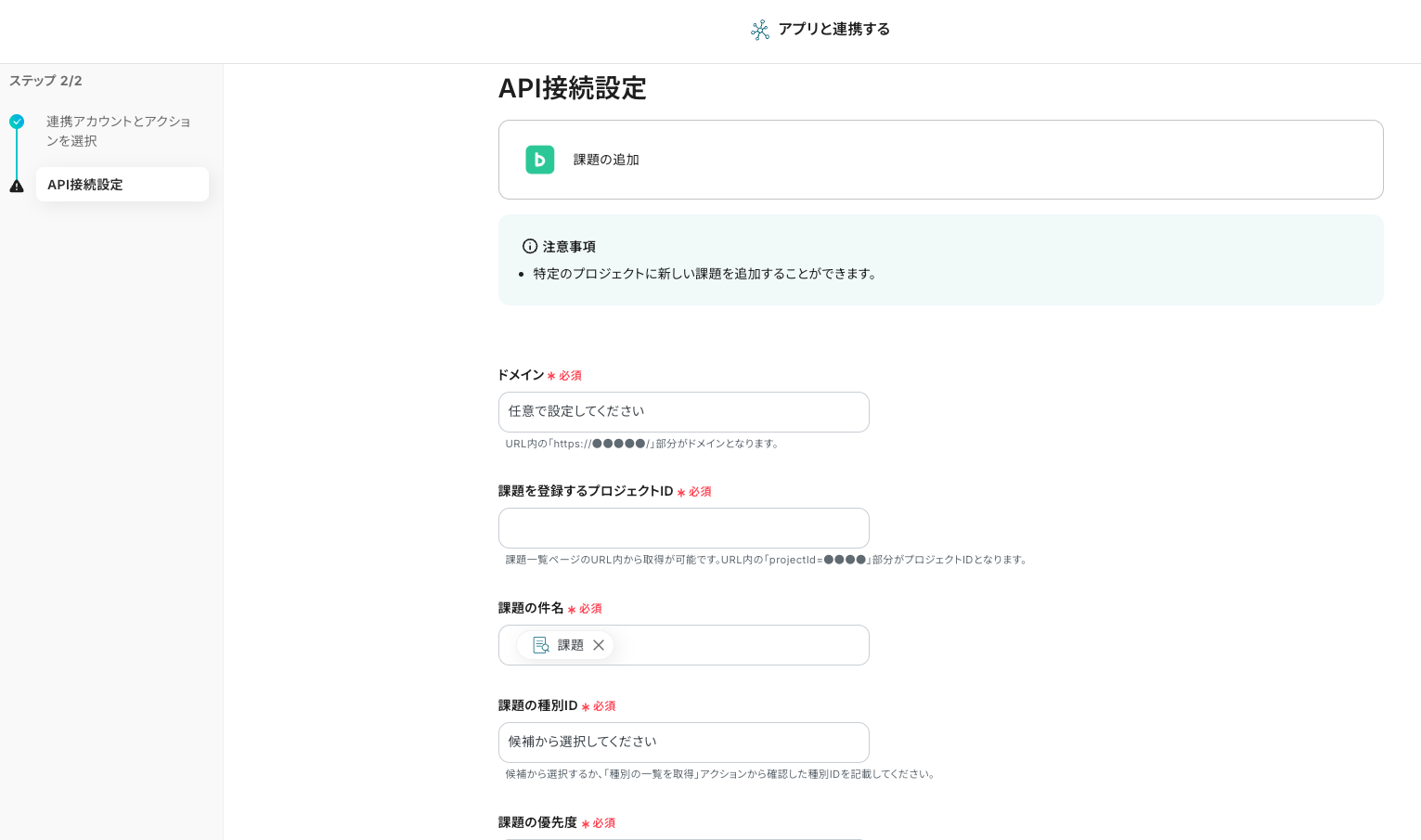 課題を登録するプロジェクトID 課題一覧ページのURLから取得した値を入力してください。