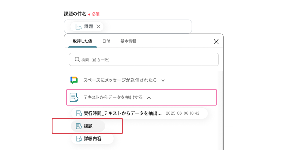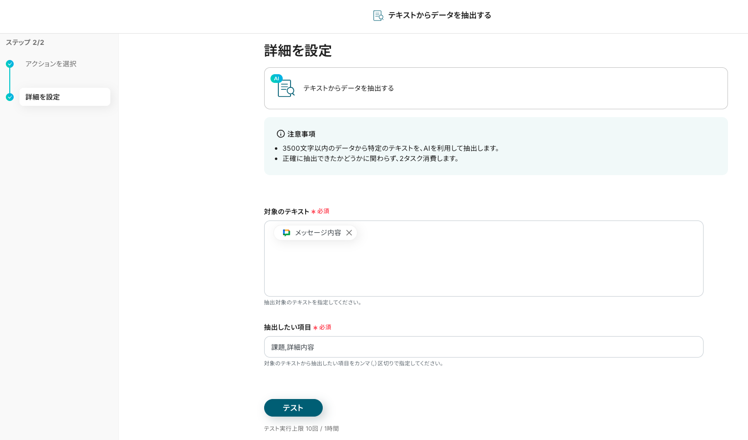 抽出したい項目 事前に「課題」「詳細内容」が設定済みです。追加の項目を入力する場合は、項目をカンマで区切ってくださいね。