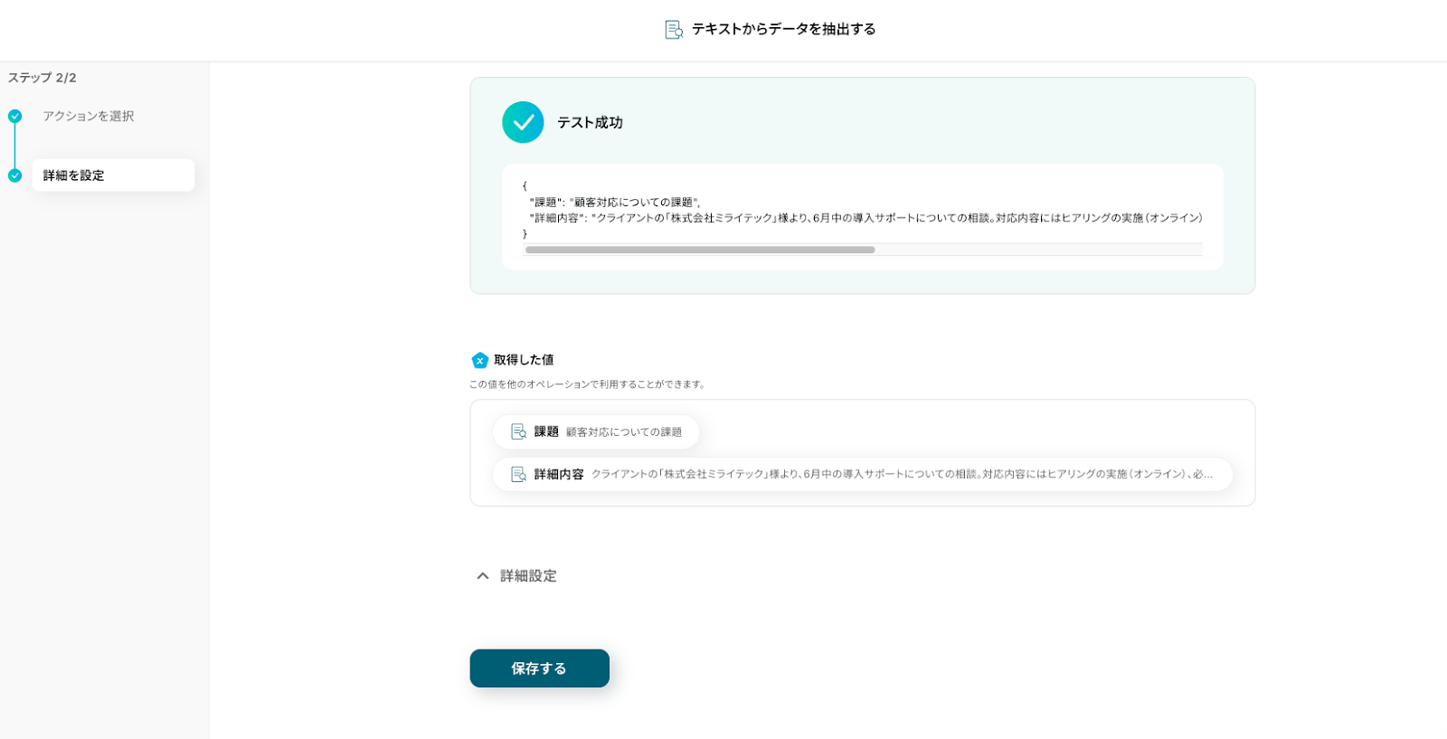 設定の確認ができたらテストボタンをクリック しましょう。 成功すると、指定した項目の値が抽出されます。※下記は抽出例です。