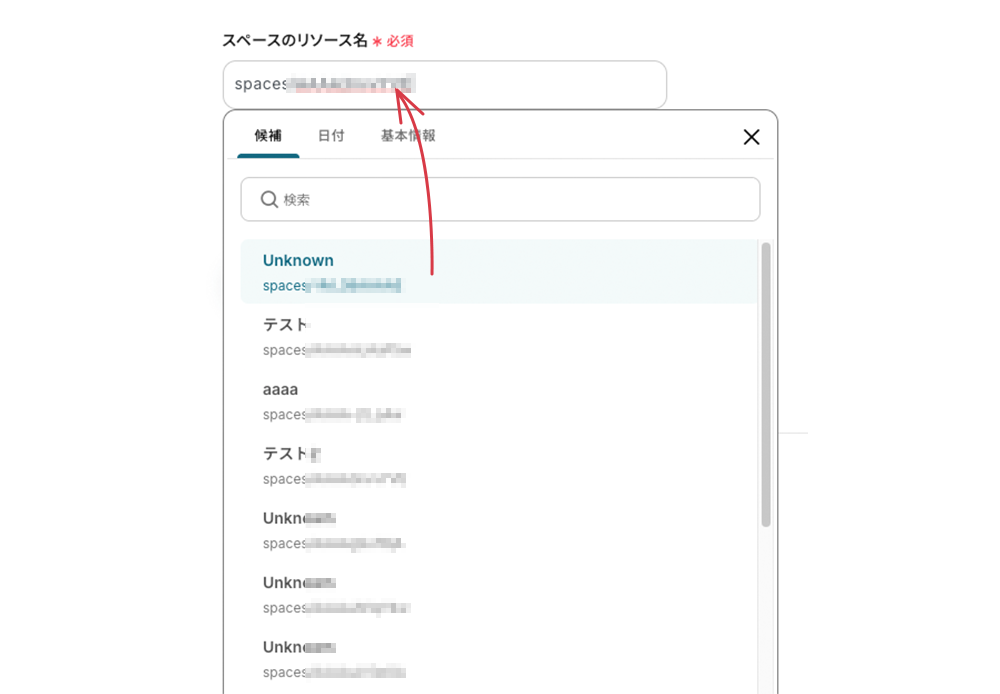 スペースのリソース名 編集欄をクリックするとプルダウンメニューが表示され、スペース名が表示されます。通知するスペースを選択すると、リソース名が引用されます。