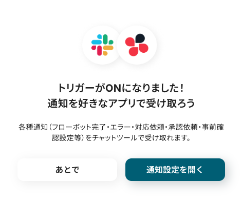 トリガーが【ON】になると、各種通知の送信先を選択できるお知らせがポップアップされます。デフォルトでは登録しているメールへ通知ですが、普段使っているチャットアプリでも通知を受け取れて便利です。