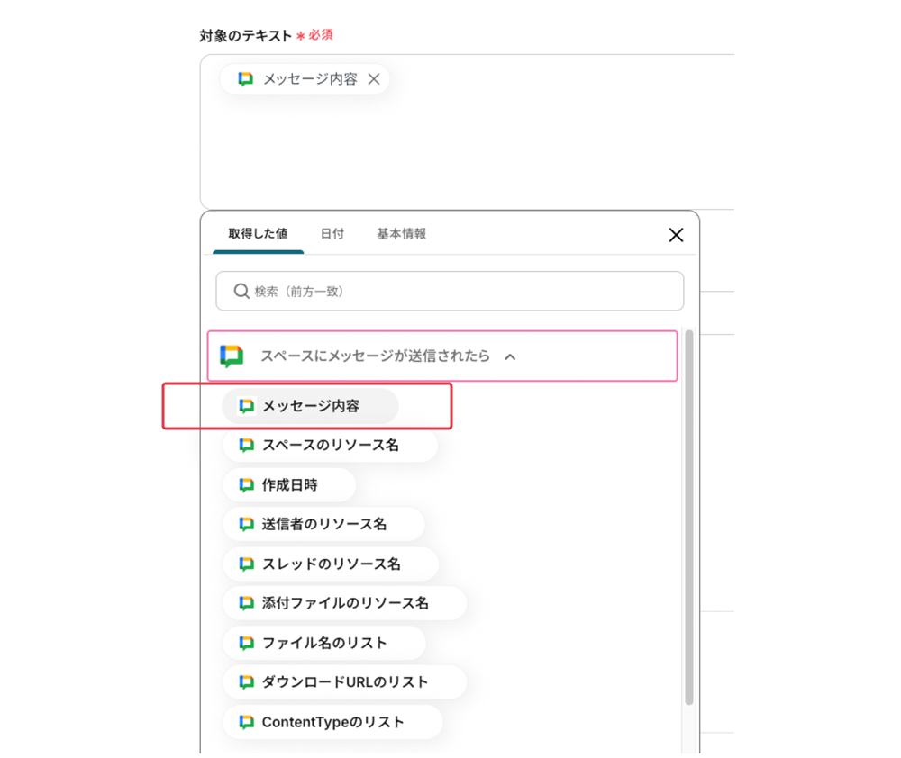 Google Chatのスペースにテスト用にメッセージを送信しましょう。 設定ができたらテストボタンをクリック します。成功すると、メッセージから検知できる項目・値が取得できます。※画像は項目のみです。