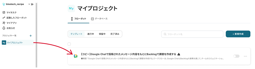 コピーしたテンプレートは、マイプロジェクトに追加されます。マイプロジェクトは左のメニューバーからアクセス可能です。