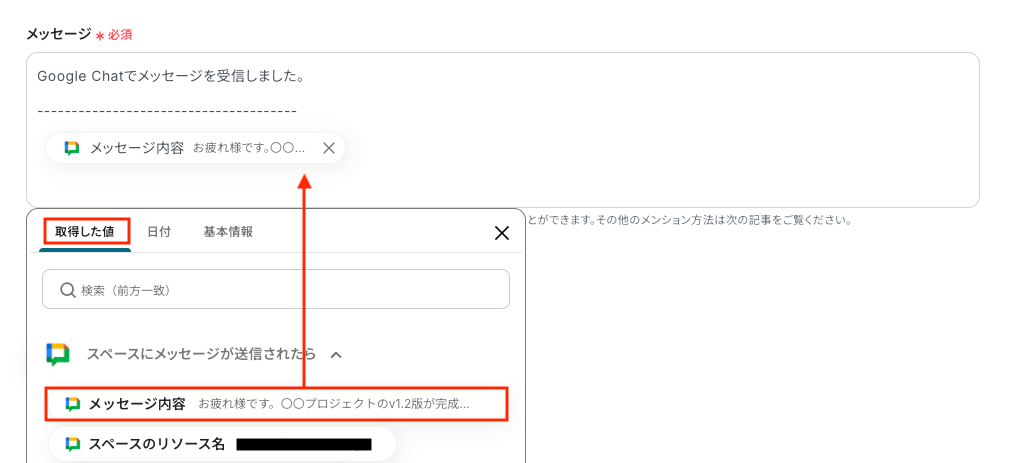「メッセージ」は取得した値から選択し、必要に応じて任意のテキストを手動で入力してください。